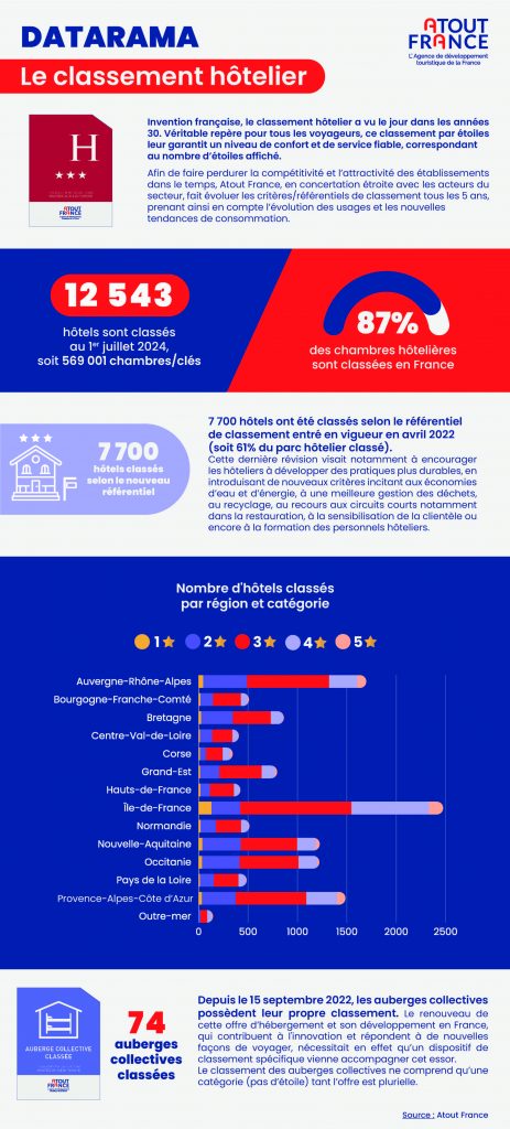 Afin de faire perdurer la compétitivité et l’attractivité des établissements dans le temps, Atout France, en concertation étroite avec les acteurs du secteur, fait évoluer les critères/référentiels de classement tous les 5 ans, prenant ainsi en compte l’évolution des usages et les nouvelles tendances de consommation.