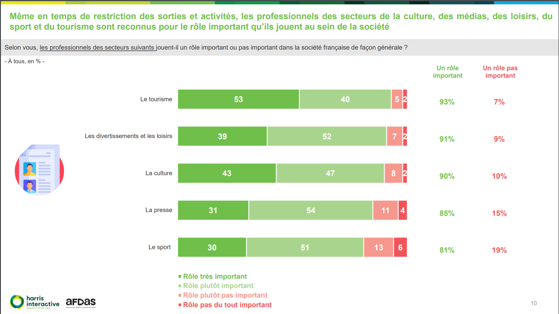 - Les professionnels des secteurs de la culture, des industries créatives, des médias, du sport, du tourisme, des loisirs jouent un rôle important dans la société selon les Français.
