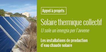 La Collectivité Territoriale de Corse, à travers son Agence dédiée à l’Urbanisme et l’Énergie (AAUC), en collaboration avec l’ADEME et l’Agence du Tourisme de la Corse ont mis en place un appel à candidatures « solaire thermique collectif » en particulier à destination des secteurs touristiques.