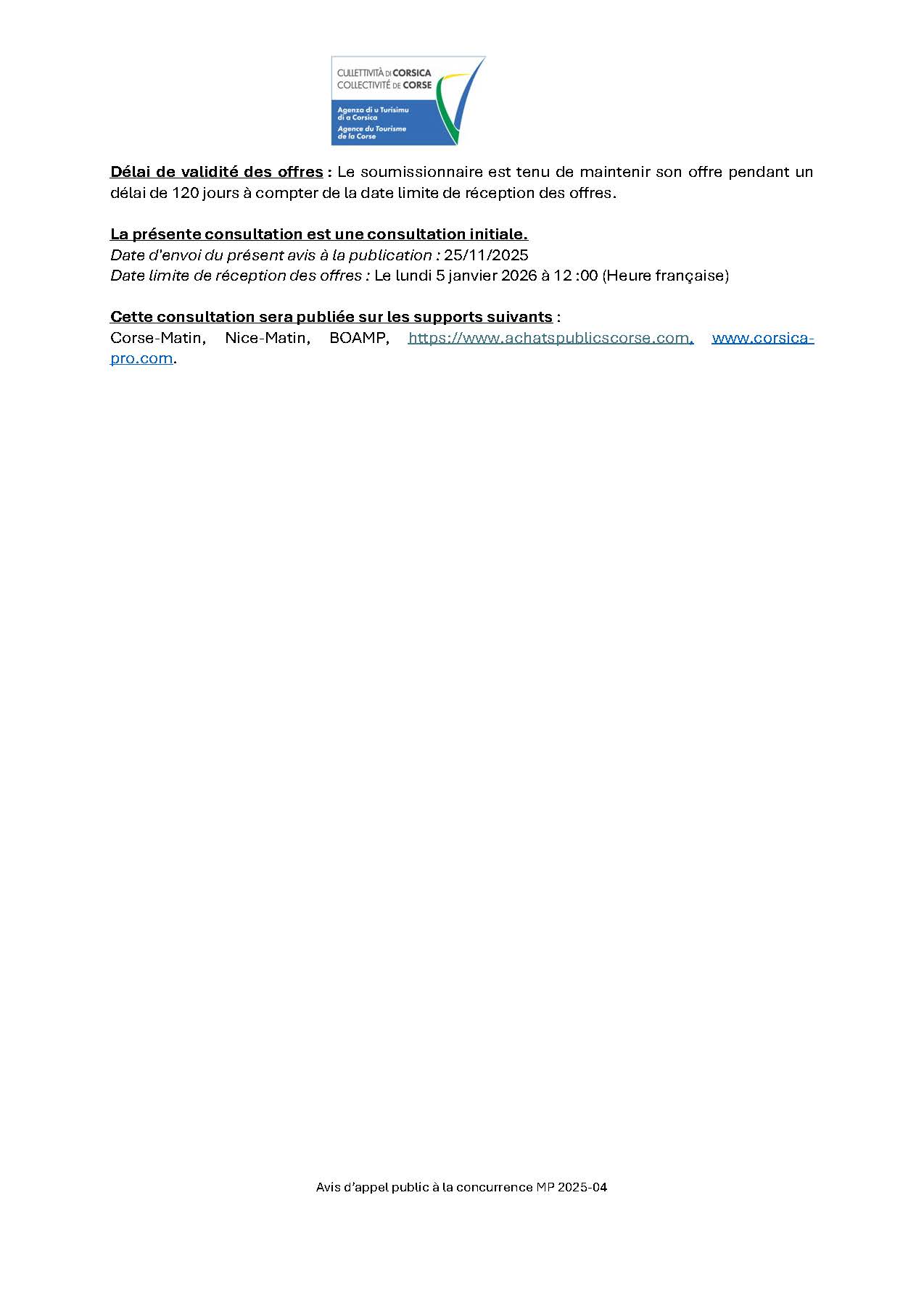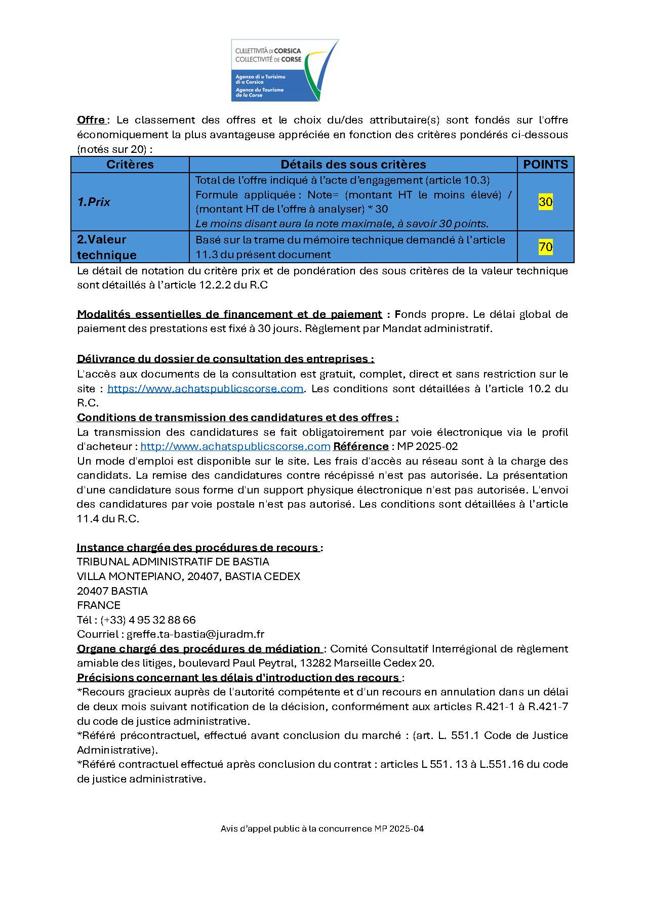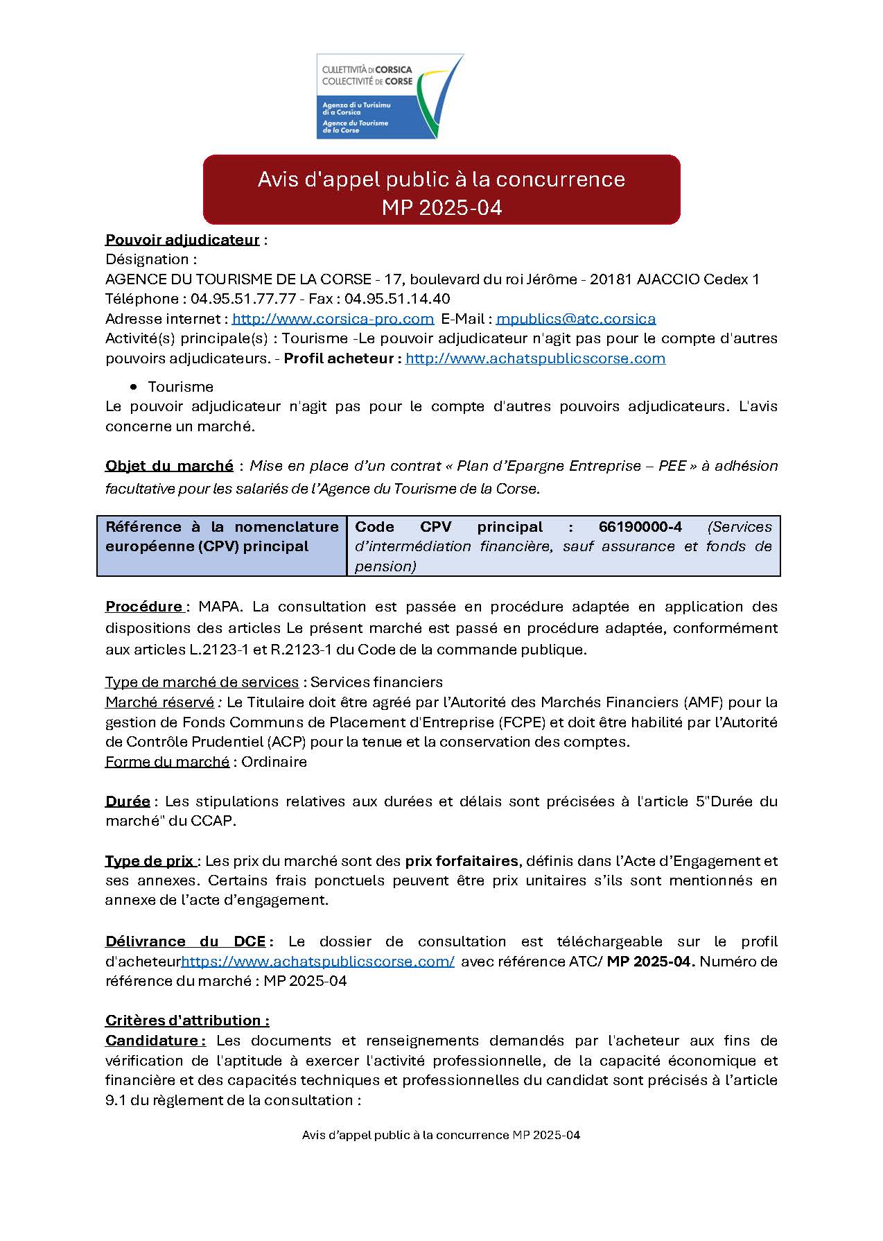Avis d’appel public à la concurrence MP 2025-04 : Mise en place d’un contrat « Plan d’Epargne Entreprise – PEE » à adhésion facultative pour les salariés de l’Agence du Tourisme de la Corse.
