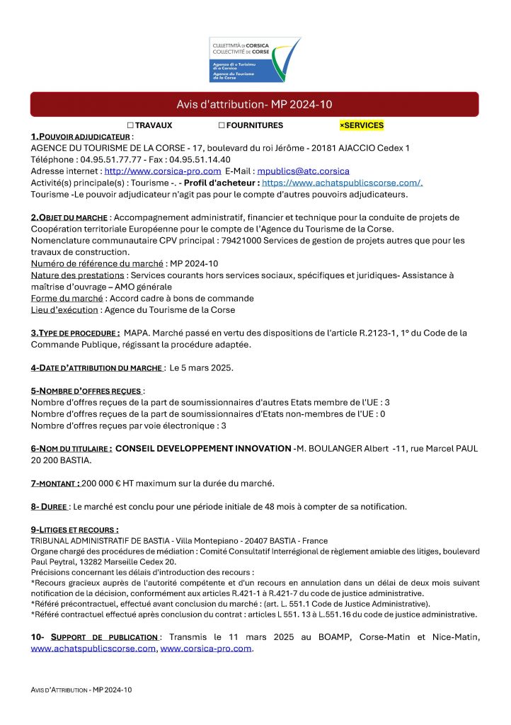 L’ATC a attribué le marché suivant : Accompagnement administratif, financier et technique pour la conduite de projets de Coopération territoriale Européenne pour le compte de l’Agence du Tourisme de la Corse