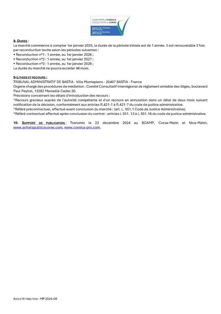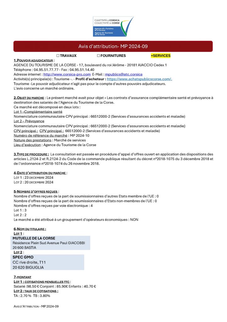 Le présent marché avait pour objet « Les contrats d’assurance complémentaire santé et prévoyance à destination des salariés de l’Agence du Tourisme de la Corse.