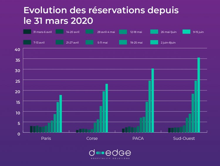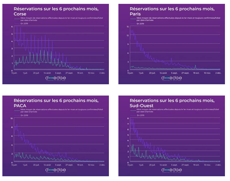 Les réservations continuent à croître sur l’ensemble des régions. La reprise reste beaucoup plus faible et lente pour Paris qui souffre de son positionnement en zone Orange sur la période observée et du fait que les réservations d’origines Internationales restent encore très limitées.