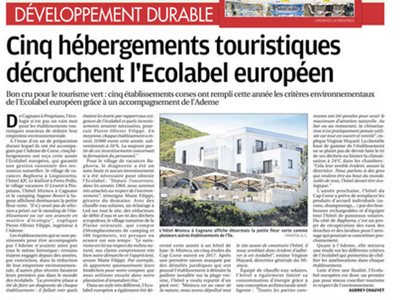 Bon cru pour le tourisme vert : cinq établissements corses ont rempli cette année les critères environnementaux de l’Ecolabel européen grâce à un accompagnement de l’Ademe