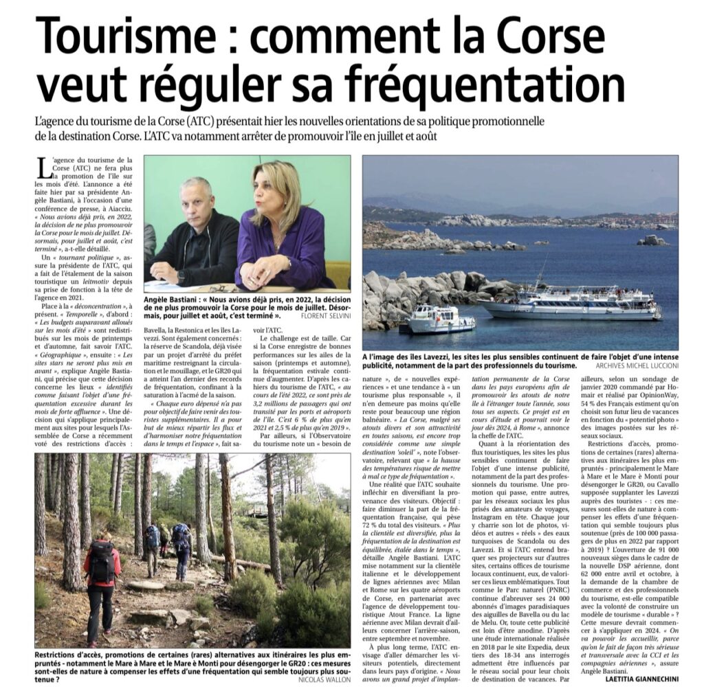 Corse-Matin : « Tourisme : comment la Corse veut réguler sa fréquentation »