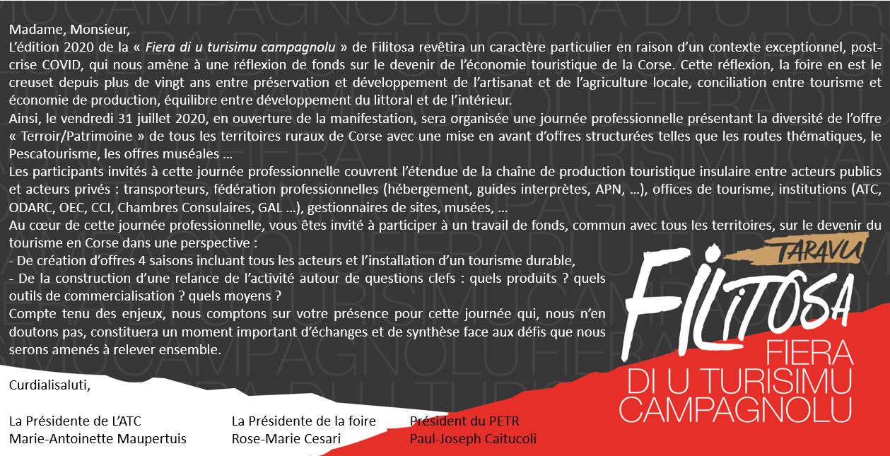 « A fiera di u turisimu campagnolu » s’adapte au contexte et cette 28ème édition sera frappée au sceau de la nouveauté. La relance du secteur touristique, l’importance des circuits courts et bien évidemment, l’étalement de la saison seront au centre des débats.  L’autre point fort de l’évènement réside dans la mise en valeur de l’ensemble des territoires de l’île qui, pour la première fois, seront représentés. Du Nord au sud de l’île, en passant par l’intérieur des terres, tous seront à l’honneur.