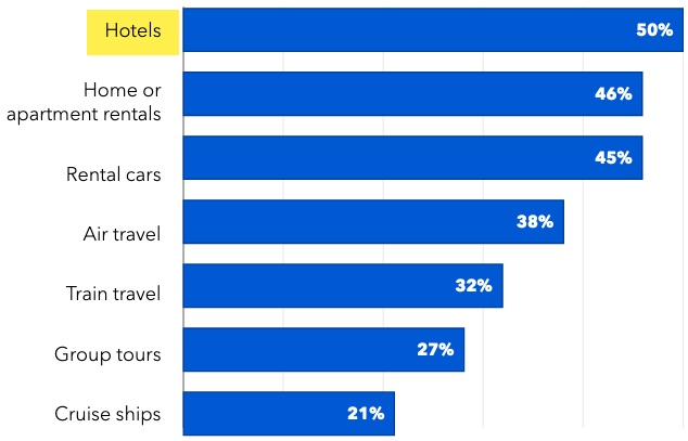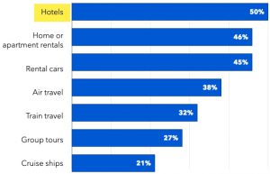 On constate ainsi que l’hébergement est le choix le plus important, source de réconfort, avec l’hôtellerie en première position tout juste devant les locations d’appartements et maisons à la Airbnb. Remarquez à quel point la mauvaise presse aura fait du tort aux compagnies de croisière qui peinent en queue de peloton.