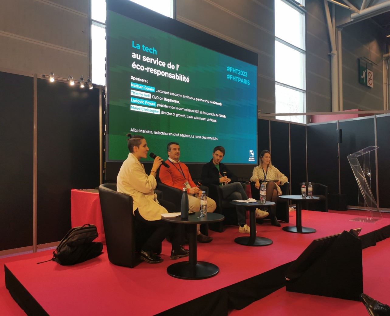 Nous avons également assisté à une conférence sur la Tech au service de l’éco responsabilité, animée par le président d’un groupe de restauration rapide, Bagelstein, une start up greenly spécialisée dans le calcul de la charge carbone, la rédactrice en chef du magazine « la revue des comptoirs » et la directrice de Voxel, un logiciel de facturation et paiement électronique .