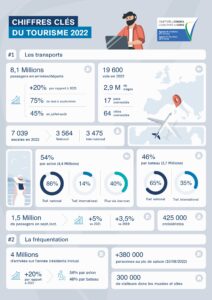 La Mission communication a réalisé une infographie mettant en lumière « les chiffres clés du tourisme 2022 » compilés et mis à jour par le Centre de Ressources de l’ATC.