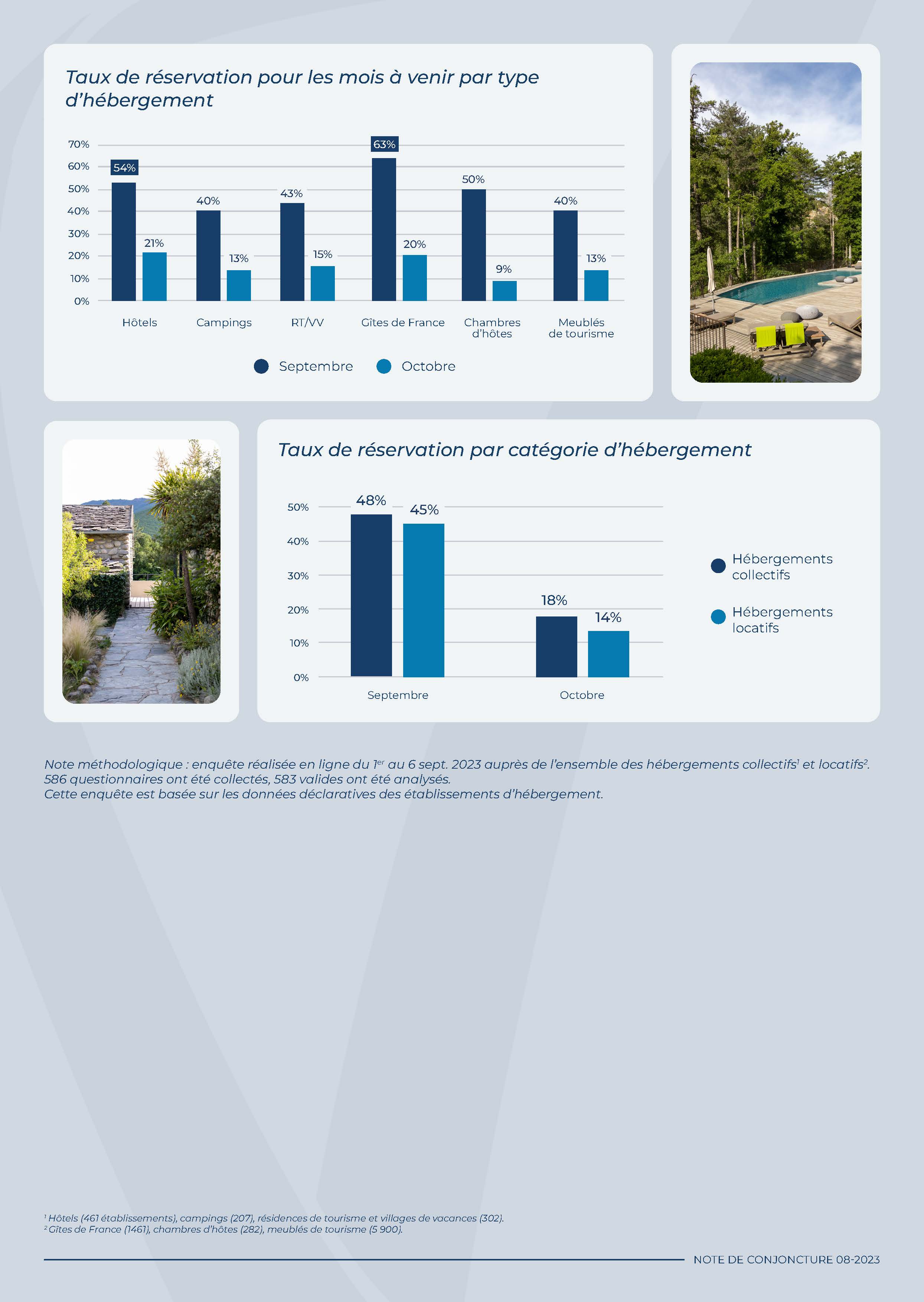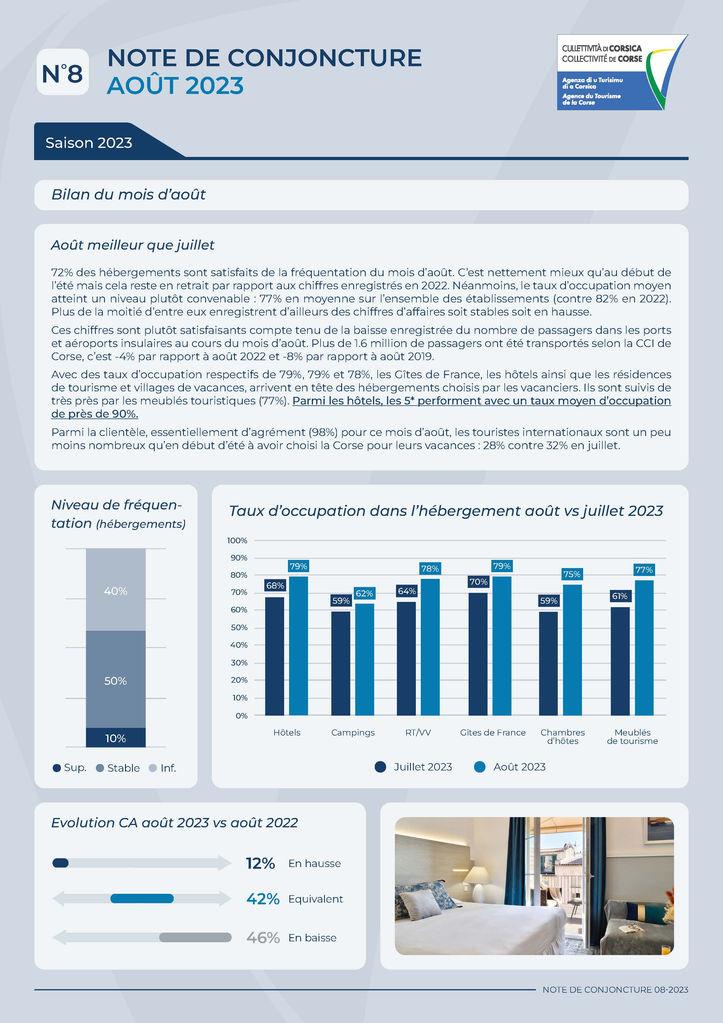 72% des hébergements sont satisfaits de la fréquentation du mois d’août. C’est nettement mieux qu’au début de l’été mais cela reste en retrait par rapport aux chiffres enregistrés en 2022. Néanmoins, le taux d’occupation moyen atteint un niveau plutôt convenable : 77% en moyenne sur l’ensemble des établissements (contre 82% en 2022).