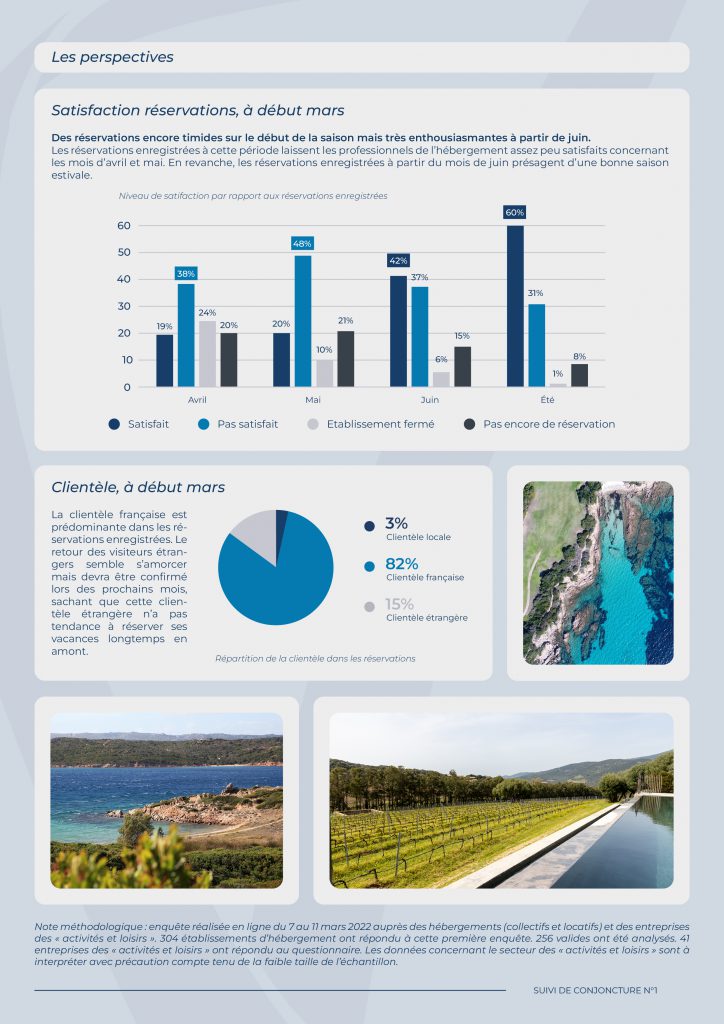Méthodologie : Enquête réalisée en ligne du 7 au 11 mars 2022 auprès des hébergements (collectifs et locatifs) et des entreprises des «activités et loisirs». 304 établissements d’hébergement ont répondu à cette première enquête. 256 valides ont été analysés. 41 entreprises des «activités et loisirs » ont répondu au questionnaire. Les données concernant le secteur des «activités et loisirs» sont à interpréter avec précaution compte tenu de la faible taille de l’échantillon.