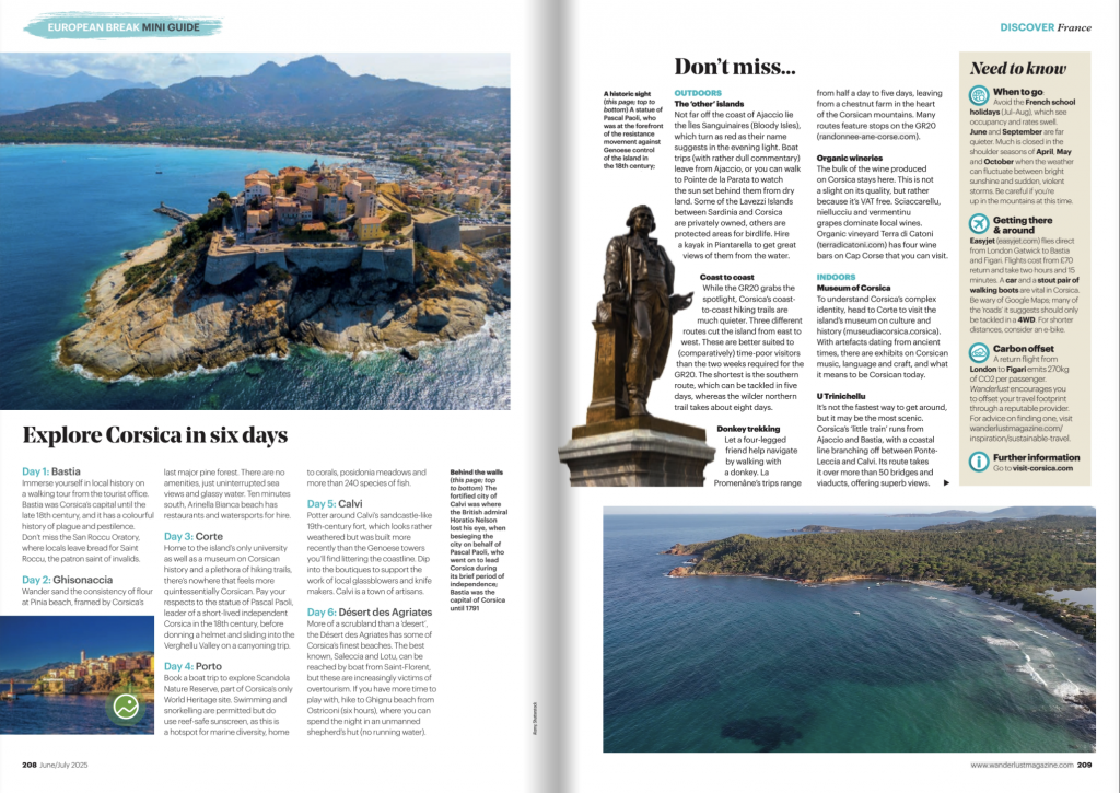 Dans son édition de juin/juillet 2025 dédiée aux destinations vertes, le magazine Wanderlust a consacré un article à la Corse, soulignant une fois de plus l’engagement de la destination en faveur d’un tourisme durable. Par ailleurs, l’île figure parmi les nommés aux Wanderlust Travel Awards dans la catégorie de l’île la plus « désirable » d’Europe. Le public est invité à voter via le lien Voting is now open – 2025 Wanderlust Reader Travel Awards, en attendant la remise des prix qui se tiendra lors d’une soirée à la National Gallery de Londres.