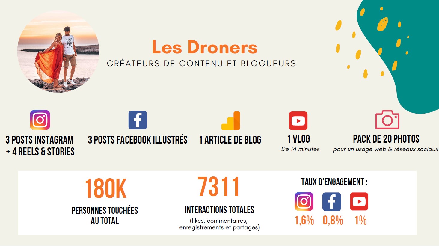 Le point fort des Droners est indéniablement la qualité de leurs contenus, vidéos, photos et rédaction. De par leur niveau de macro-influenceurs (quasiment 80k d’abonnés cumulés sur Instagram, Facebook et Youtube), ils obtiennent une couverture organique importante et arrivent à toucher un grand nombre de personnes.