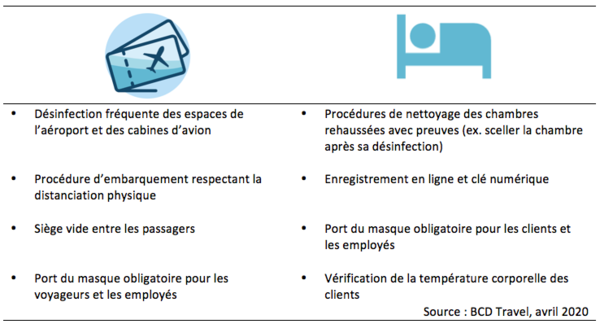 Selon plusieurs experts du milieu du tourisme d’affaires, la reprise sera conditionnelle à cette confiance. L’agence de voyages d’affaires BCD Travel a interrogé les principaux intéressés. Les résultats démontrent la nécessité d’assurer un environnement sécuritaire pour gagner la confiance des voyageurs d’affaires. Le tableau ci-dessous illustre les mesures auxquelles ils s’attendent pour la reprise de leurs déplacements.